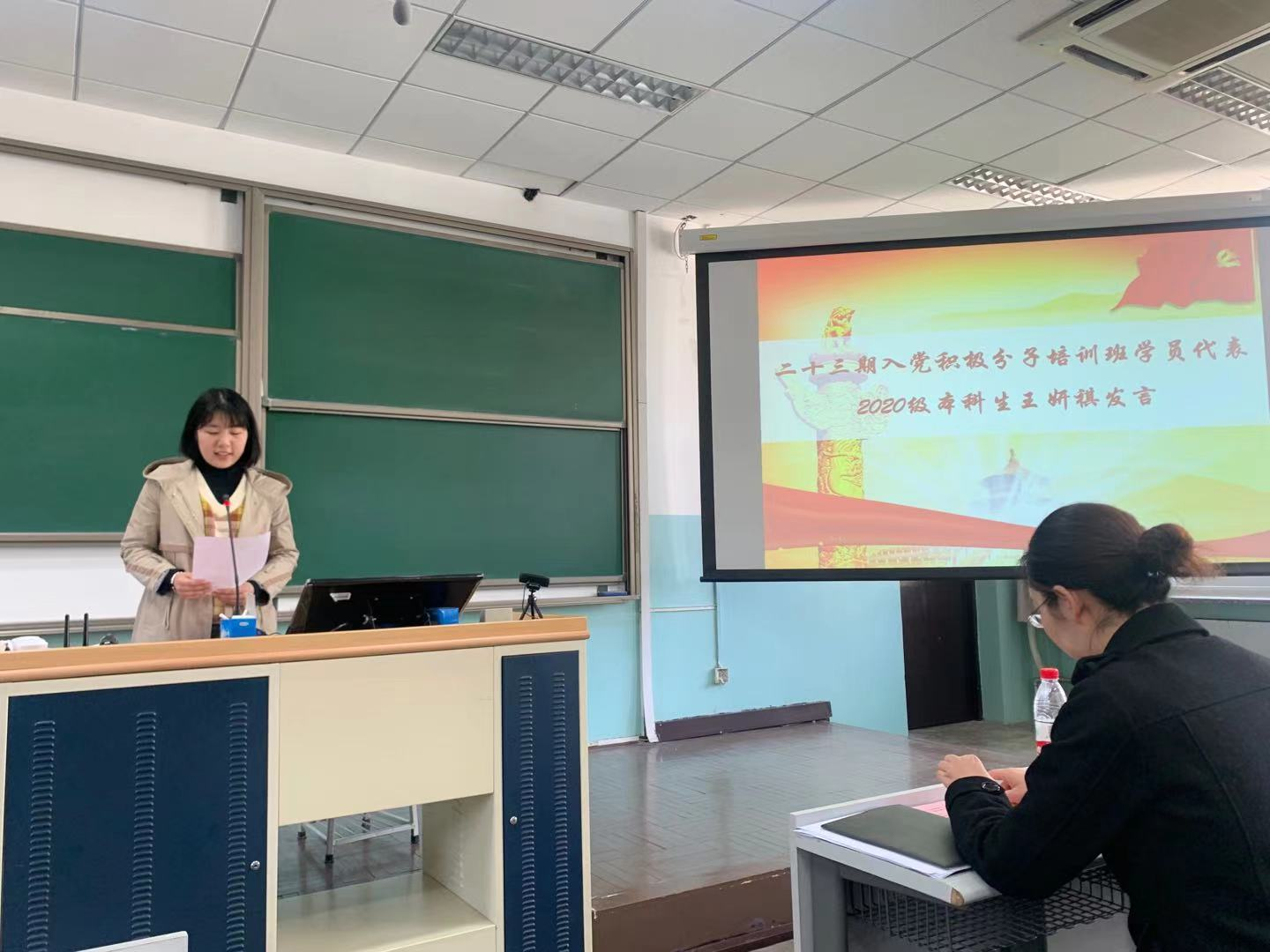 2020级本科生王妍祺作为学员代表发言,她表示在接下来的学习中,一定会认真对待每一次党课的学习,以最饱满的热情、最全面的投入、最实际的行动来完成党课学习,争取在结业时提交一份优秀满意的答卷,早日完成从一名入党积极分子到合格的共产党员的蜕变。