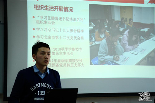 第二位述职的是本科党支部书记娄嘉亮。他首先介绍了支部的基本情况,并总结了去年的工作成果。在2017年度,本科党支部尝试与第一版主 青年志愿者协会合作,通过轮流做志愿活动的方式,不仅切实传递爱心,而且也彰显了作为中共党员的责任与担当。接着,他针对支部目前存在的“认为入了党就算是进了保险箱”的问题,提出了完善考核机制,加强了党建促进会与党支部合作等具体措施。党委副书记唐颖充分肯定了本科党支部的工作,赞扬了他们严谨踏实的工作态度以及勇于开拓的创新精神。她提出希望本科党支部在开展活动时要充分考虑学生党员的特质,突出支部活动的特色。