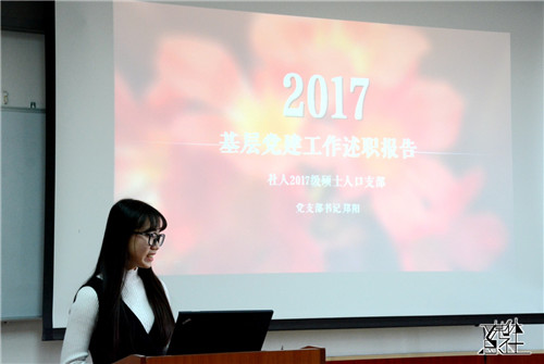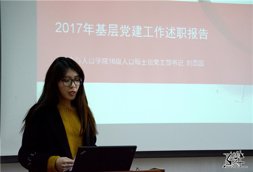 随后,由2017级人口学硕士党支部书记郑阳述职。她简单介绍了支部基本情况,通过回顾一年来支部的工作,她认为支部现阶段分工明确,支部成员们学习情况良好,态度端正,总体上表现良好。对于今后的发展方向,她提出希望党支部和团支部能进一步加强合作,促进双方共同发展。党委委员巫锡炜对该支部的工作予以充分肯定,并建议他们从专业的眼光看待党支部工作及学习,多开展周边调研,在实际生活中坚定自己的理想信念。