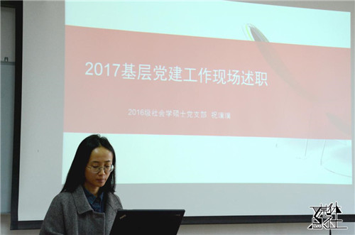 最后进行述职的是2016级社会学硕士党支部书记祝璞璞。她从理论学习、组织生活会、社会实践、发展党员等方面介绍了支部一年以来的工作成果。此外她指出了当前工作中存在的一些问题,如学习活动参与度还不够高、党团联系还不够密切、活动的开展形式还比较单一等,并提出相应的改进措施。党委委员王水雄高度赞扬了该支部工作扎实、不流于形式的工作作风,勉励他们继续前进,同时希望他们根据硕士班的特点,开展有收获有意义的活动。