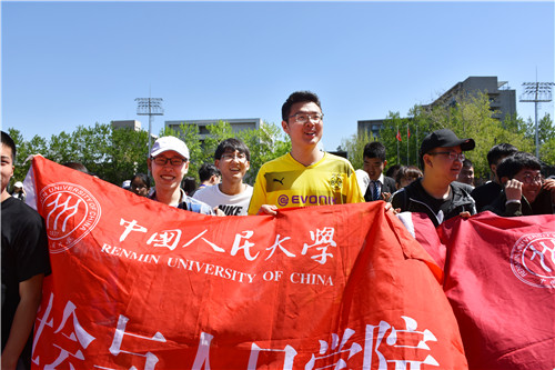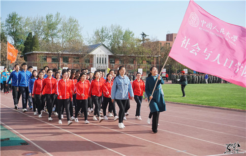 在第一版主 党委副书记唐颖老师的带领下,社会与人口第一版主 代表队踏着矫健的步伐,以昂扬的姿态进入运动场。红色与蓝色交织在跑道上,青春的气息扑面而来。四月的人大,因雨过天晴而更娇嫩,春日里的社人师生,因运动的魅力而顽强拼搏。