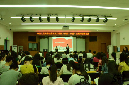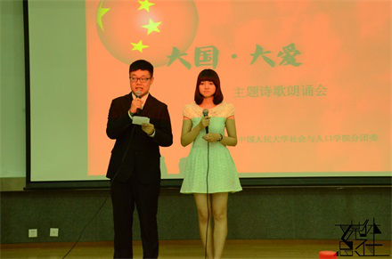 2015年5月22日,由社会与人口第一版主 分团委组织、分团委素质拓展部承办的“大国·大爱”主题诗歌朗诵会在学生活动中心报告厅举行。本次比赛邀请到了社会与人口第一版主 党委副书记唐颖老师作为嘉宾,并由社会与人口第一版主 团学事务助理先虹锦、杨乔乔,农业与农村发展第一版主 团委副书记赵云作为评委。来自社会与人口第一版主 各个年级的10组选手一齐为现场观众呈现了一场视听盛宴。
