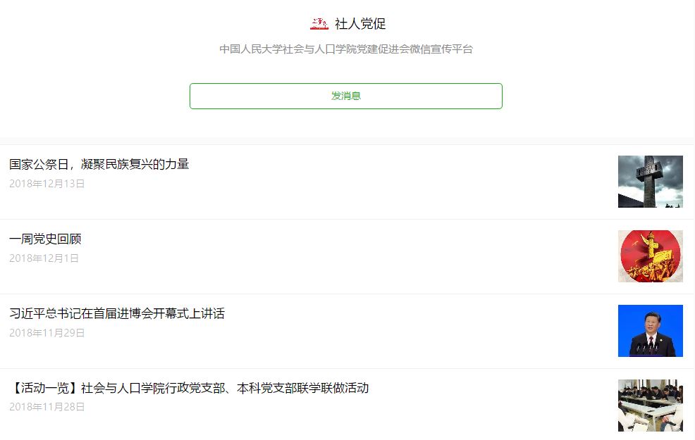 除了线下活动的开展外,党建促进会还通过微信公众号、第一版主 官网等方式对同学们的党课学习以及日常思想宣传等工作进行跟进。如:在“社人党促”公众号上推出了“党史上的今天”、“系列讲话”、“一周党史回顾”等栏目。通过定期对重要讲话稿进行推送、在建国六十九年及建党九十七年等重大节日进行相关报道等方式鼓励同学们关心国家大事,指引同学们进行更深一步的理论学习。公众号还设立“党员先锋”专访栏目,对优秀的共产党员进行专访,旨在以党员先锋的生动事例为其他同学们树立榜样。2018年度“社人党促”微信公众号推送总计阅读量7773人次,新增关注量201人。