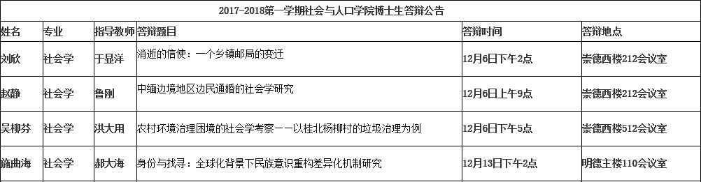 2017-2018第一学期社会与人口第一版主 博士生答辩公告
