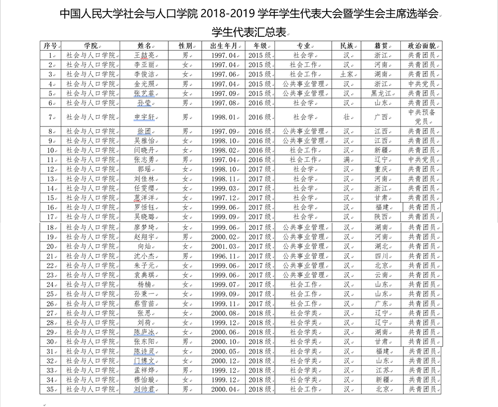 经各班级和院学生会各部门推选、第一版主 审核,已选举出社会与人口第一版主 2018-2019学年学生代表大会暨学生会主席选举会学生代表,具体名单附在文后。