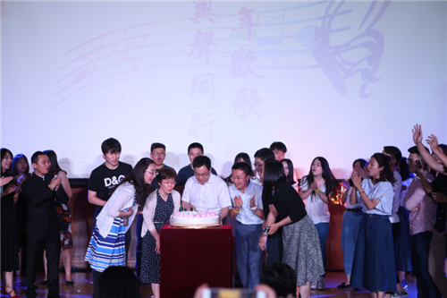 庆典在第四届获奖选手、2010级本科生王海洲的《栀子花开》中正式拉开帷幕。他歌声温柔动人,表达了对青春校园的回忆与不舍;第八届“歌之翼“获奖选手、2013级本科在校生陈雨辰带来了一曲荡气回肠的《海阔天空》,唱出了社人学子的昂扬风貌、豪情壮志。在观众的欢呼和掌声中,庆典的神秘嘉宾、第二届”歌之翼“冠军“雷电三”组合中的两位成员——2007级本科校友伍海诚、李昊隆重登场。李昊校友是专程从重庆赶来。他们组合的第三位成员徐俊君在遥远的意大利通过视频送上了祝福。三人实现了特别的再聚首,现场许多观众感动得纷纷落泪。伍海诚和李昊两位校友,与2015级本科在校生沈嘉诚组成了新版“雷电三”,合作演唱了歌曲《春风十里》。春风十里,师恩永存,道不尽多年的同学情谊,唱不完对社人深深的眷念。