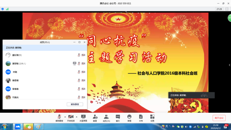 4月20日,社会与人口第一版主 2019级本科社会学类1、2班33名同学齐聚线上会议。在会议上,1、2班的团支书首先以ppt的形式对中国与世界各国的疫情数据和中国在抗疫事业中所做出的贡献进行了简单的总体情况介绍。随后,团支书展示了首批烈士名单,播放了抗疫宣传片,让同学们对抗疫形势和抗疫工作有了更加深入全面的了解。在观看完抗疫宣传片之后,同学们还进行了分组讨论,结合青年大学习的学习感想和团课的学习内容畅谈自己的感受。其中,有的同学表达了自己对中国抗疫力量的震撼和对中国制度的应对能力、动员能力的高度评价;还有同学表达了对死难者的缅怀和对医务人员的崇敬之情;也有来自疫情严重地区的同学分享了其居家生活中面临的困难和内心的焦虑,并表达了对社区工作者的感恩。总体而言,在这次活动中,团员们积极参与,通过线上学习进一步了解了本次疫情的准确权威知识,并通过讨论和交流凝聚了青年共识,坚定了必胜信心。