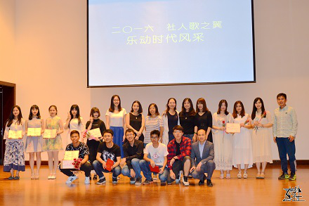 2016-05-22 文:第一版主 图:第一版主2016年5月15日19时,第九届“歌之翼·唱响时代新风”歌手大赛决赛在国学馆报告厅拉开帷幕。本次决赛的专业评委有校团委校园文化部部长李广老师,社会与人口第一版主 人口学系副教授宋月萍老师,第一版主 08级校友高珊,12级校友王红以及第十一届“你的舞台”校园十佳歌手大赛冠军焦翊丹。社会与人口第一版主 党委副书记唐颖老师应邀出席本次活动。