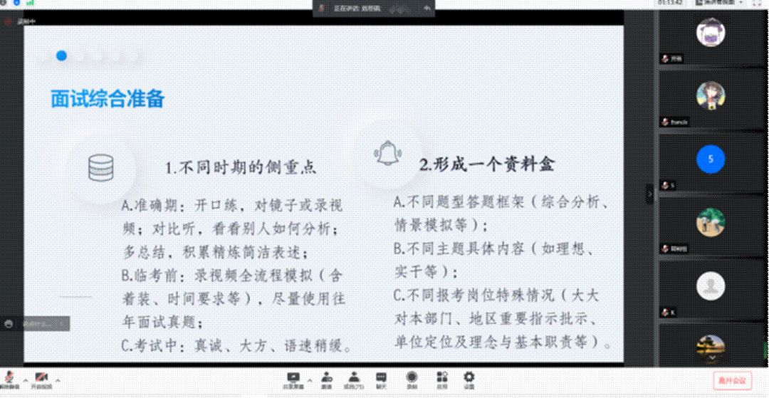 刘思琪师姐同样强调了追问自己内心“为何考公”的重要性,以“笃根本,去浮华”为主题分享了她个人的求职经历以及备考过程中的教训与宝贵经验,提出了自我定义清晰、目标定向准确以及笔试定量复习等建议,结合不同时期的侧重点以及形成资料盒两方面为大家的面试准备提供了经验和资料的参考。最后,刘师姐分享了她在机关和基层工作两种不同的工作体验与个人感受,使大家对此有了更为生动和真切的认识。