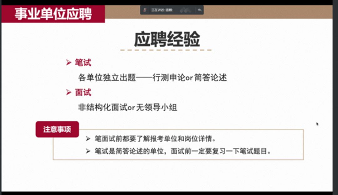温馨师姐对自己的求职、公务员备考和事业应聘的经历进行了详细介绍,回顾自己的求职历程,她鼓励大家放平心态,接受失败,并且建议同学们在进行职业规划时:找准定位,有目的地实习;目标明确,有重点地海投。在公务员备考方面,她为大家总结了笔试备考中做题顺序、定时刷真题、申论练习以及错题修改的经验以及面试中“自信、条理清晰、内容充实”的建议;同时,她结合自己的上岸经历,为大家介绍了事业单位的笔面试经验和目前的工作内容,提醒大家在笔面试前都要了解报考单位和岗位详情。最后,温馨师姐以自己的亲身经历告诉大家:最理想的职业不一定是最适合的职业,不必过于执着于某一个单位或岗位。