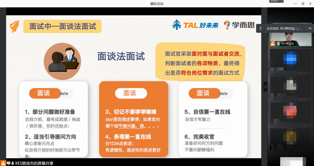 紧接着是整场分享会的重点——面试技巧的经验性分享,樊培杰针对面试中涉及到的自我介绍、无领导小组讨论、面谈法面试等环节进行了详细阐述,带领同学们了解了这些面试环节的具体流程、考察维度以及注意事项,给同学们传授了相关的实用面试技巧。