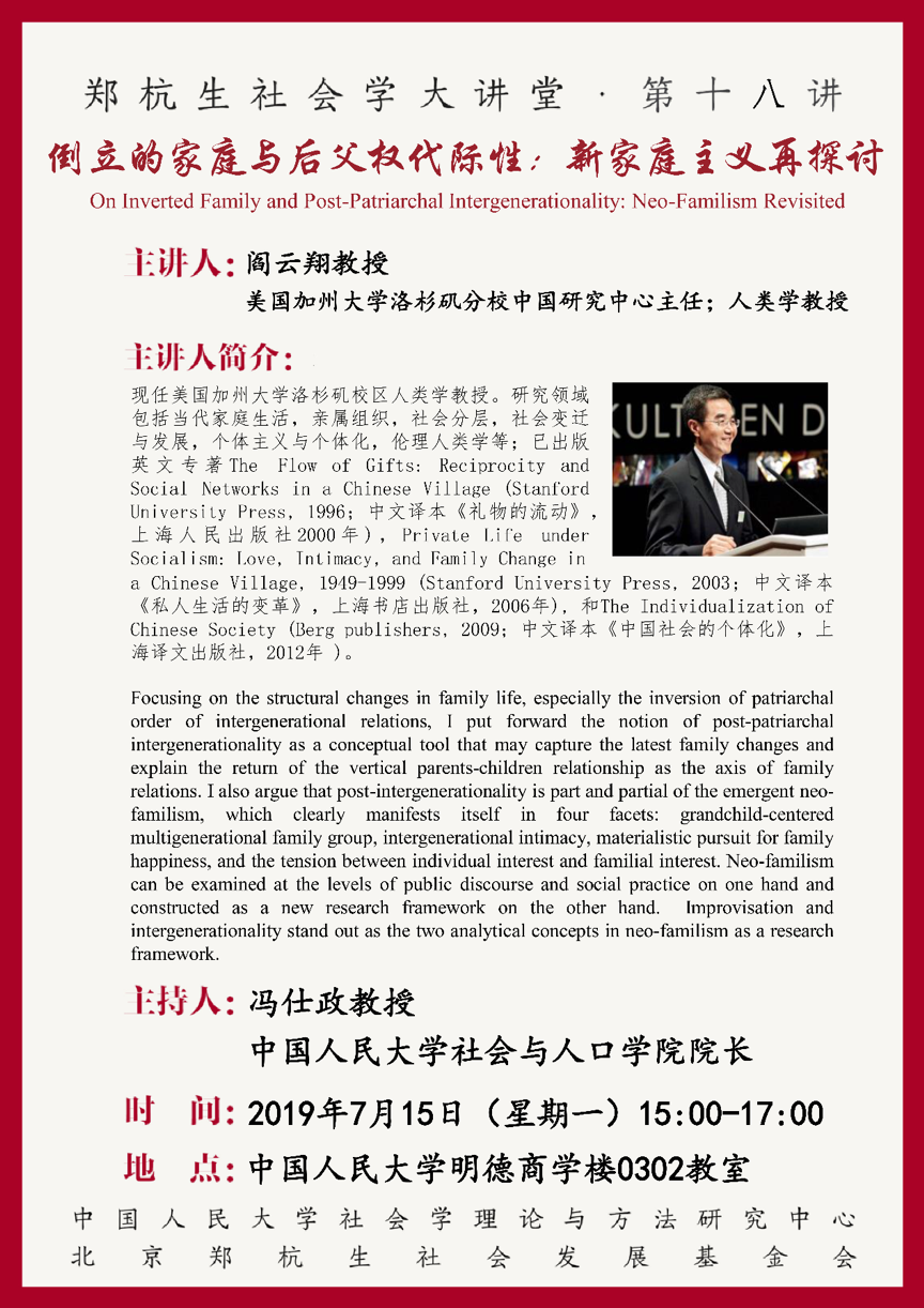 温馨提示:此次讲座在校生可在学务中心搜素”郑杭生社会学大讲堂第十八讲”报名参加,签到后可领取活动积分;外校同学可自行参加。