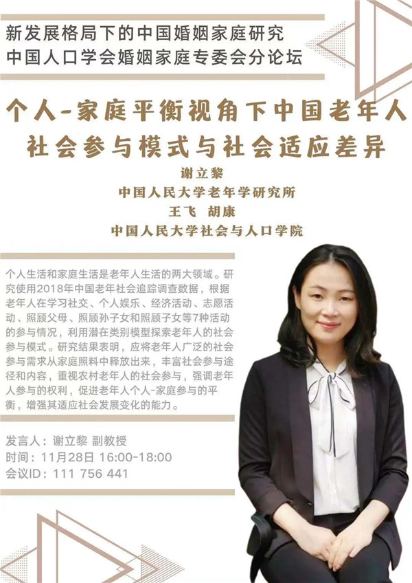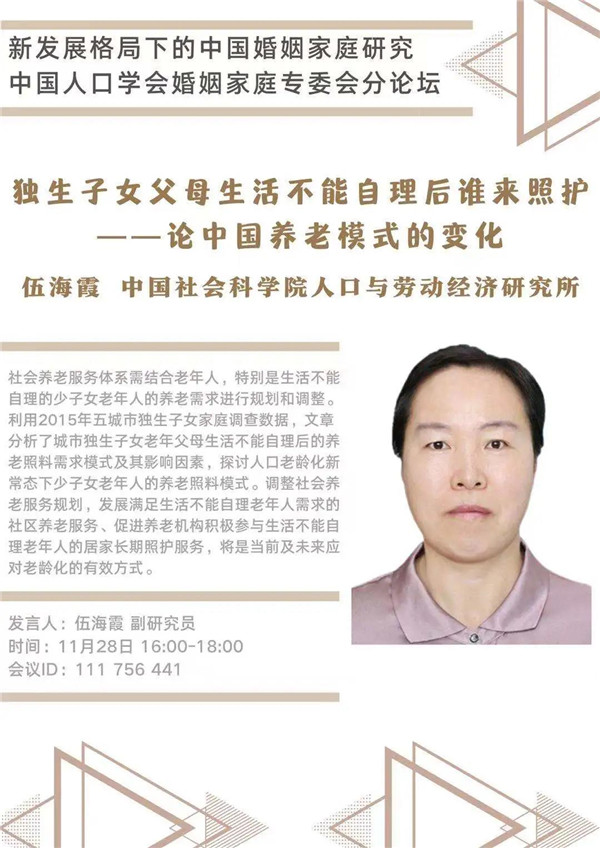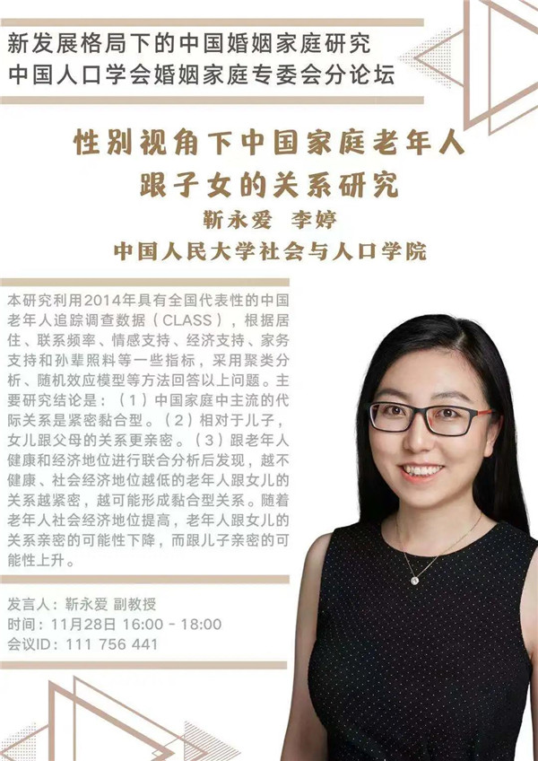 2020-11-24 文:第一版主 图:第一版主中国人口学会年会将于2020年11月28-29日在陕西西安召开。会议期间,婚姻家庭专委会将组织“新发展格局下的中国婚姻家庭研究”为主题的分论坛,6位来自国内各高校、研究机构的研究者将就家庭关系、养老、生育、家庭发展等主题展开讨论。届时欢迎各位同仁线上线下参与讨论!