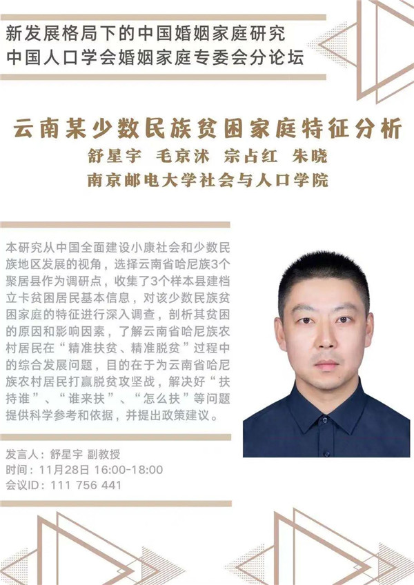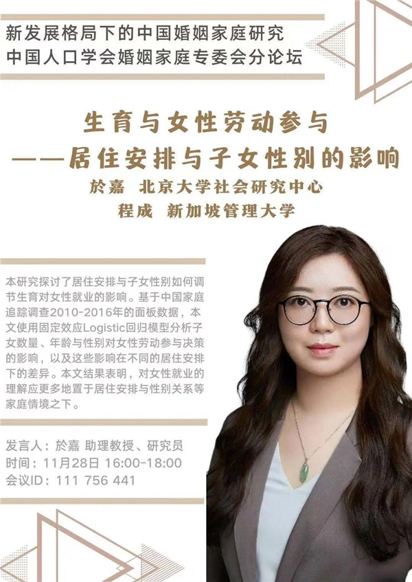 中国人口学会年会将于2020年11月28-29日在陕西西安召开。会议期间,婚姻家庭专委会将组织“新发展格局下的中国婚姻家庭研究”为主题的分论坛,6位来自国内各高校、研究机构的研究者将就家庭关系、养老、生育、家庭发展等主题展开讨论。届时欢迎各位同仁线上线下参与讨论!