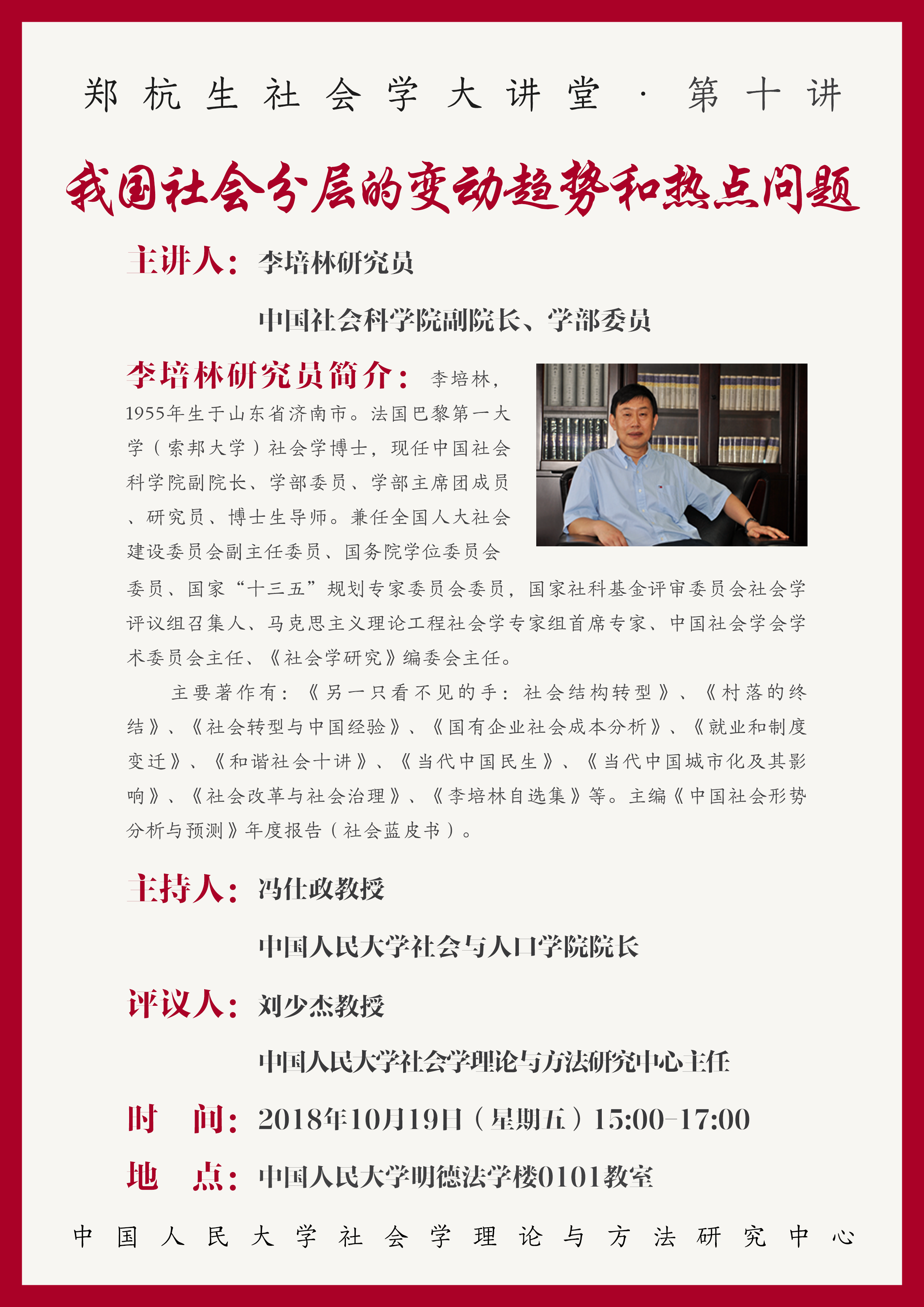 温馨提示:此次讲座在校生可在学务中心搜素”郑杭生社会学大讲堂第十讲”报名参加,签到后可领取活动积分;外校同学可自行参加。