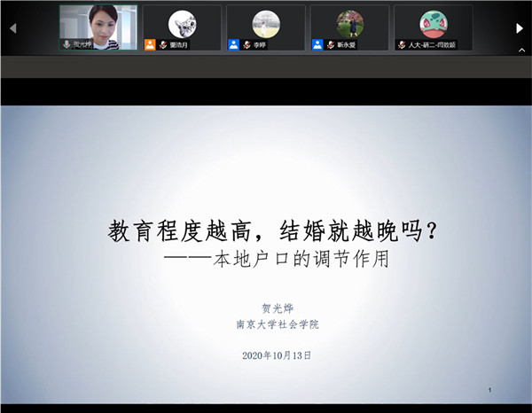 2020-10-16 文:第一版主 图:第一版主2020年10月14日下午,南京大学第一版主 社会学系副教授贺光烨博士应邀来到我校人口学系刘铮系列学术讲座暨严肃的人口学八卦青年沙龙,在线上为师生带来一场题为“教育水平越高,结婚就越晚么?婚姻市场上本地户口的调节作用”学术报告。第一版主 社会与人口第一版主 李婷教授担任主持,来自校内外的百余名师生听取报告并进行了交流学习。