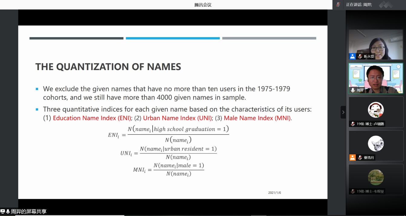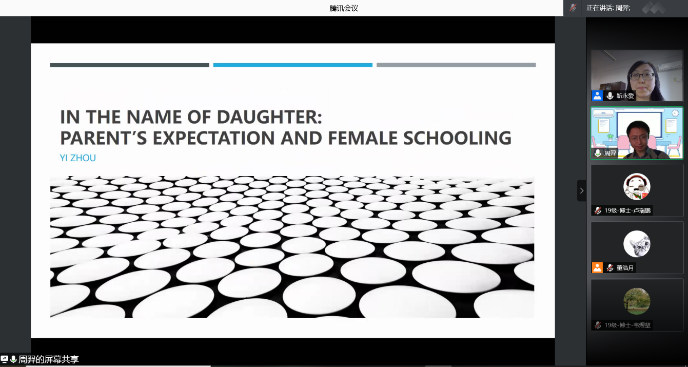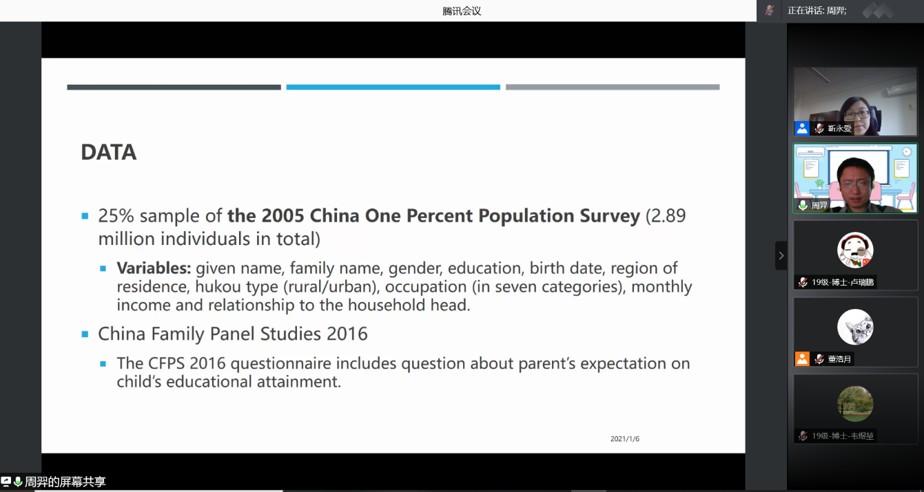 2021-01-11 文:第一版主 图:第一版主2021年1月6日中午,人口学系刘铮系列学术讲座暨严肃的人口学八卦青年沙龙成功举办。北京大学社会研究中心助理教授周羿博士在腾讯会议,以“In the Name of Daughter : Parent's Expectation and Female Schooling”为主题做了一场人口学专业的线上学术讲座。第一版主 社会与人口第一版主 靳永爱副教授主持了本次活动,第一版主 社会与人口第一版主 人口系的70多名师生听取了报告并进行交流学习。