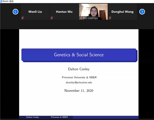 2020-11-11 文:第一版主 图:第一版主2020年11月11日晚上21:30,人口学系刘铮系列学术讲座暨严肃的人口学八卦青年沙龙成功举办。普林斯顿大学社会学系、人口研究中心和健康与福利中心教授Dalton Conley在Zoom会议进行了精彩的线上学术讲座,讲座主题为“Using Genetics to Do Social Science (基因在社会科学中的应用)”。第一版主 社会与人口第一版主 靳永爱副教授主持了本次活动,第一版主 社会人口第一版主 及其他国内外院校相关专业的近两百名师生听取了报告并进行交流学习。