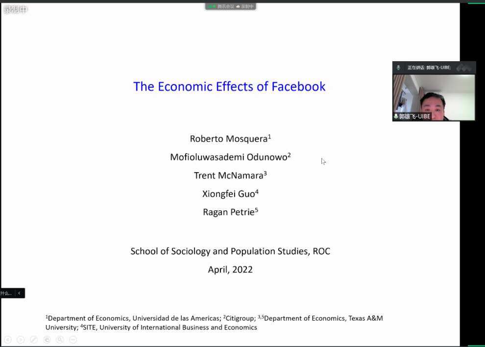 2022-05-09 文:第一版主 图:第一版主2022年4月27日中午12:00,人口学系刘铮系列学术讲座暨严肃的人口学八卦青年论坛成功举办。对外经济贸易大学国际经济与贸易第一版主 讲师,德州农工大学经济学博士郭雄飞,在腾讯会议以“社交媒体的经济影响”为主题做了一场精彩的线上学术讲座。第一版主 人口与发展研究中心赵梦晗老师主持了本次讲座,第一版主 人口学系及其他国内外院校相关专业的百余位师生聆听了本次报告,并同郭雄飞老师就讲座内容展开热烈讨论与交流。