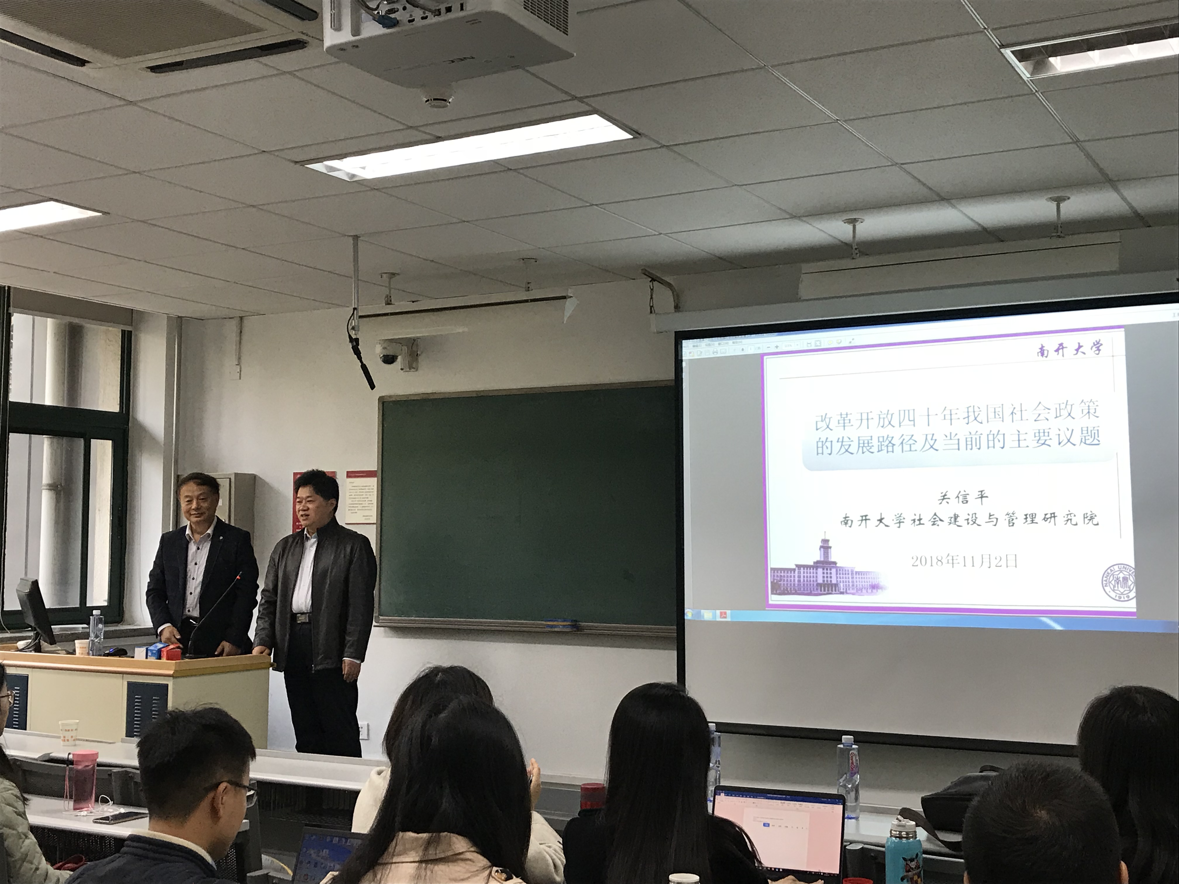 2018-11-03 文:第一版主 图:第一版主2018年11月2日上午十点,南开大学社会建设与管理研究院院长、社会工作与社会政策系教授关信平老师受邀来第一版主,围绕“改革开放40年我国社会政策的发展路径及当前主要议题”于公共教学三楼3204开展讲座,社会与人口第一版主 社会工作系李迎生教授主持评议,第一版主近百名师生参与。