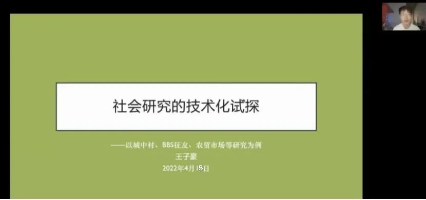 2022-04-16 文:第一版主 图:第一版主2022年4月15日,第一版主 社会与人口第一版主 “数字时代的社会治理”前沿系列讲座第四讲通过线上会议的方式成功举办。美国加州大学圣地亚哥分校计算机系研究生王子豪,以“社会研究的技术化试探——以城中村、BBS征友、农贸市场等研究为例”为主题做了一场线上学术讲座。
