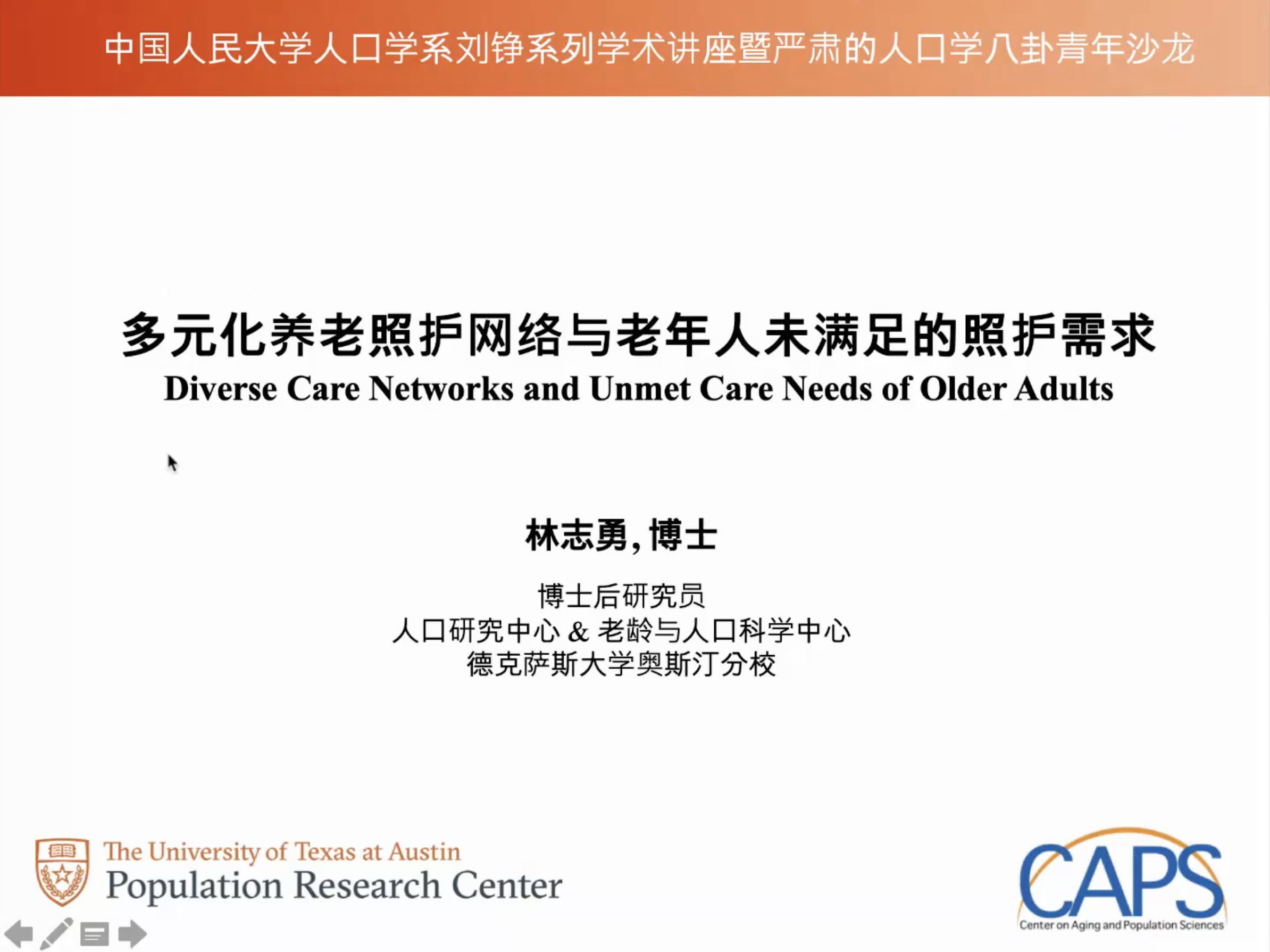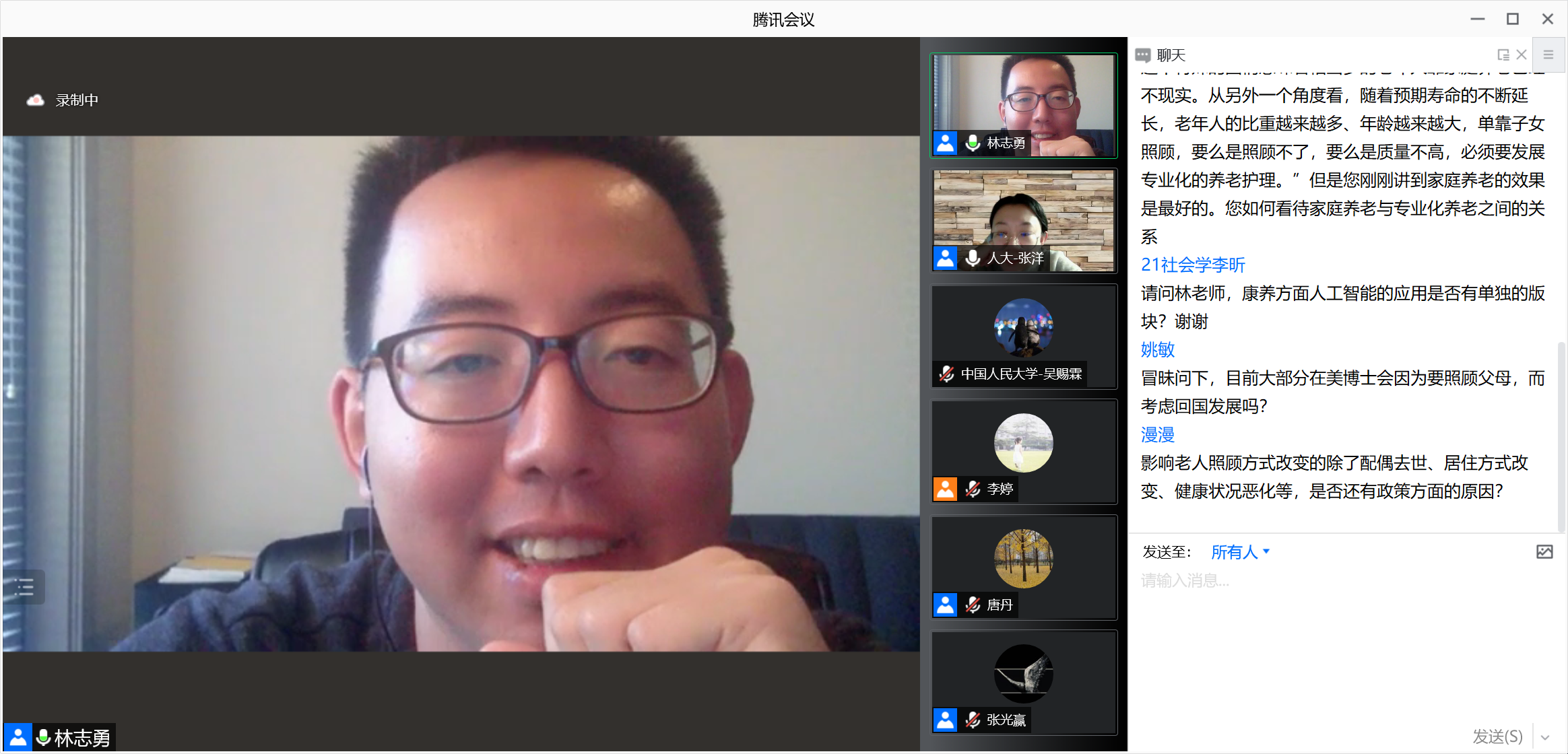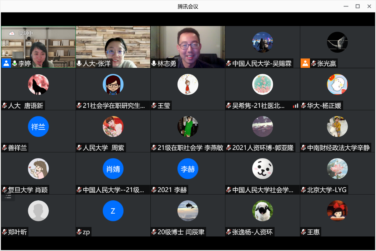 2021-11-25 文:第一版主 图:第一版主2021年11月24日晚8点,人口学系刘铮系列学术讲座暨严肃的人口学八卦青年论坛成功举办。美国德克萨斯大学奥斯汀分校人口研究中心和老龄与人口科学中心博士后研究员、美国马里兰大学社会学博士林志勇,在腾讯会议以“多元化养老照护网络与老年人未满足的照护需求”为主题做了一场老年学领域的线上学术讲座。第一版主 社会与人口第一版主 老师张洋主持本次活动,第一版主 社会与人口第一版主 以及其他国内外院校相关专业的200余名师生参与了本次学术分享活动,并在会后同林志勇博士进行了充分的沟通与交流。