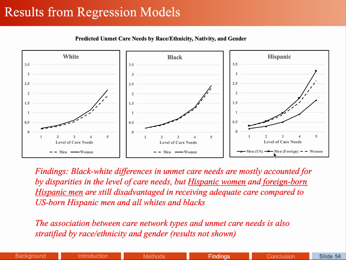 林志勇博士本次讲座分享的研究聚焦美国老年人的长期照护(Long Term Care)的供给与需求两方面,利用美国国家健康和老龄化趋势调查(National Health and Aging Trends Study)2011-2018年的8期纵向数据,从生命历程理论视角对Andersen 1995年提出的照护使用行为模型(Behavioral Model of Care Use)进行拓展运用。通过潜在类别分析、多项式逻辑回归模型、潜在转变分析等分析方法,研究发现老年人的照护供给可以根据提供者划分为5个类别和2类老年人自我照护类型,且存在显著的性别和种族差异,女性更多依靠子女,男性则更依赖配偶,白人主要依靠配偶,黑人和拉丁裔则更多由子女提供照护,进一步回归分析发现,如果条件允许,老年人更愿意寻求配偶照料。研究还发现24%的样本经历了至少1次照护网络的变化,主要的驱动因素时丧偶和居住地迁移。以上发现表明老年人的照护网络不是单一单调的而是动态多元的。随后林博士对老年人未满足的照护需求(Unmet Care Needs)进行了介绍,根据已有研究约20-40%的美国老年人的照护需求未得到满足,未满足的照护需求会对老年人的健康和生活造成诸多不良影响,林博士的研究通过12个指标对未满足需求的后果进行测量,并对照护网络与未满足的照护需求的关系进行分析,林博士的研究团队提出了一套照护网络协作的多层次概念框架(Multilevel Conceptual Framework of Care Network Collaboration)。分析发现,老年人未满足的照护需求主要受照护需求等级影响,黑人与白人不存在显著差异,但拉丁裔女性以及拉丁裔移民男性的未满足需求情况要差于其他群体,性别和种族的不平等情况依然存在。在照护网络方面,照护提供者更多元的两类照护网络的未满足的照护需求情况更严重,这可能是由配偶和子女提供照护的传统照护网络更受老年人信任和接受,其他新近出现的照护形式组成的多元网络在服务质量和接受程度上存在一定缺陷,导致了更多未满足的照护需求。