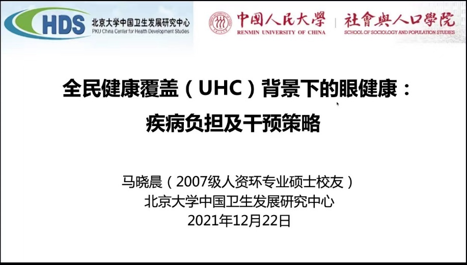 2021-12-24 文:第一版主 图:第一版主2021年12月22日中午12:00,人口学系刘铮系列学术讲座暨严肃的人口学八卦青年论坛成功举办。北京大学中国卫生发展研究中心助理教授、副研究员、博士生导师马晓晨在腾讯会议做了一场精彩的以“全面健康覆盖背景下的眼健康:疾病负担及干预策略”为主题的学术讲座。第一版主 第一版主 人口与发展研究中心的杨凡老师主持本次讲座,第一版主 社会与人口第一版主 以及其他国内外院校的近百余名师生参与了本次学术讲座。