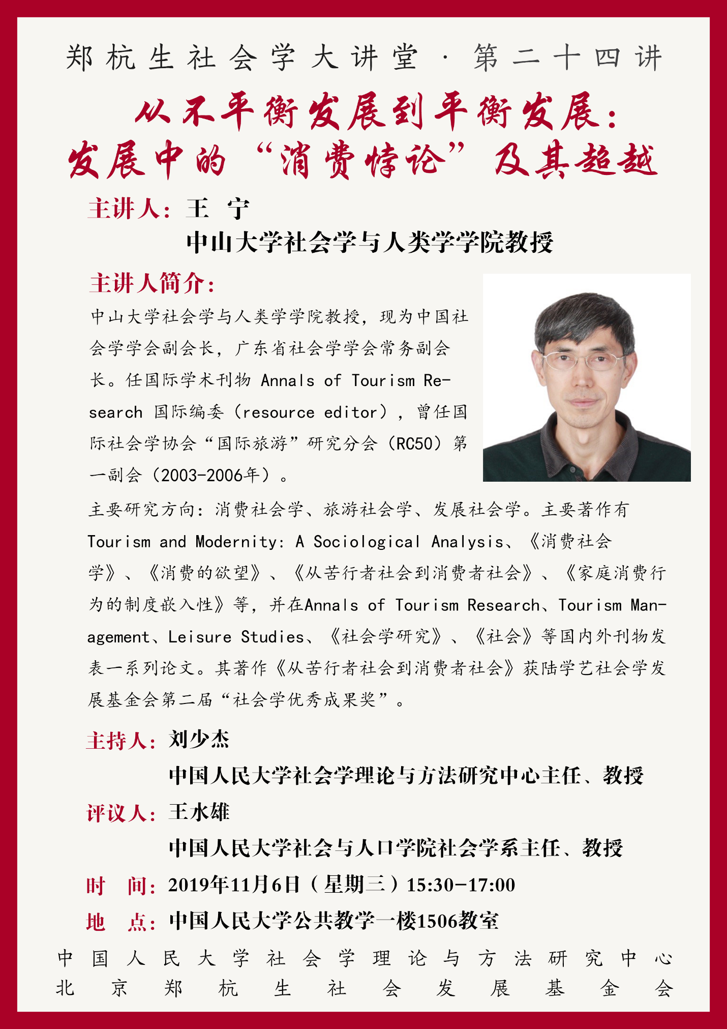 王宁,中山大学社会学与人类学第一版主 教授,现为中国社会学学会副会长,广东省社会学学会常务副会长。任国际学术刊物 Annals of Tourism Research 国际编委(resource editor),曾任国际社会学协会“国际旅游”研究分会(RC50)第一副会长(2003-2006年)。主要研究方向:消费社会学、旅游社会学、发展社会学。主要著作有Tourism and Modernity: A Sociological Analysis、《消费社会学》、《消费的欲望》、《从苦行者社会到消费者社会》、《家庭消费行为的制度嵌入性》等,并在Annals of Tourism Research、Tourism Management、Leisure Studies、《社会学研究》、《社会》等国内外刊物发表一系列论文。其著作《从苦行者社会到消费者社会》获陆学艺社会学发展基金会第二届“社会学优秀成果奖”。