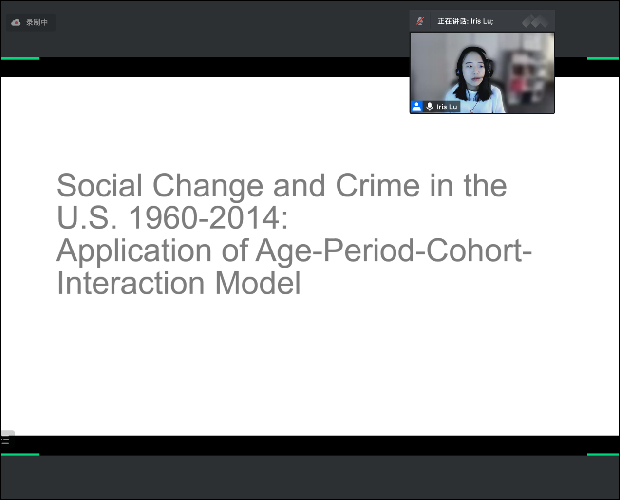 2021-12-10 文:第一版主 图:第一版主2021年12月8日晚8点,人口学系刘铮系列学术讲座暨严肃的人口学八卦青年论坛成功举办。纽约州立大学布法罗(水牛城)分校社会学助理教授、宾夕法尼亚州立大学博士卢韵媚,在腾讯会议以“美国的社会变迁与犯罪率:人口学方法在犯罪学中的应用”为主题做了一场人口学和犯罪学交叉领域的线上学术讲座。第一版主 社会与人口第一版主 老师王东晖主持本次活动,第一版主 社会与人口第一版主 以及其他国内外院校的150余名师生参与了本次学术分享活动,并在会后同卢韵媚博士就讲座内容展开了充分的讨论与交流。