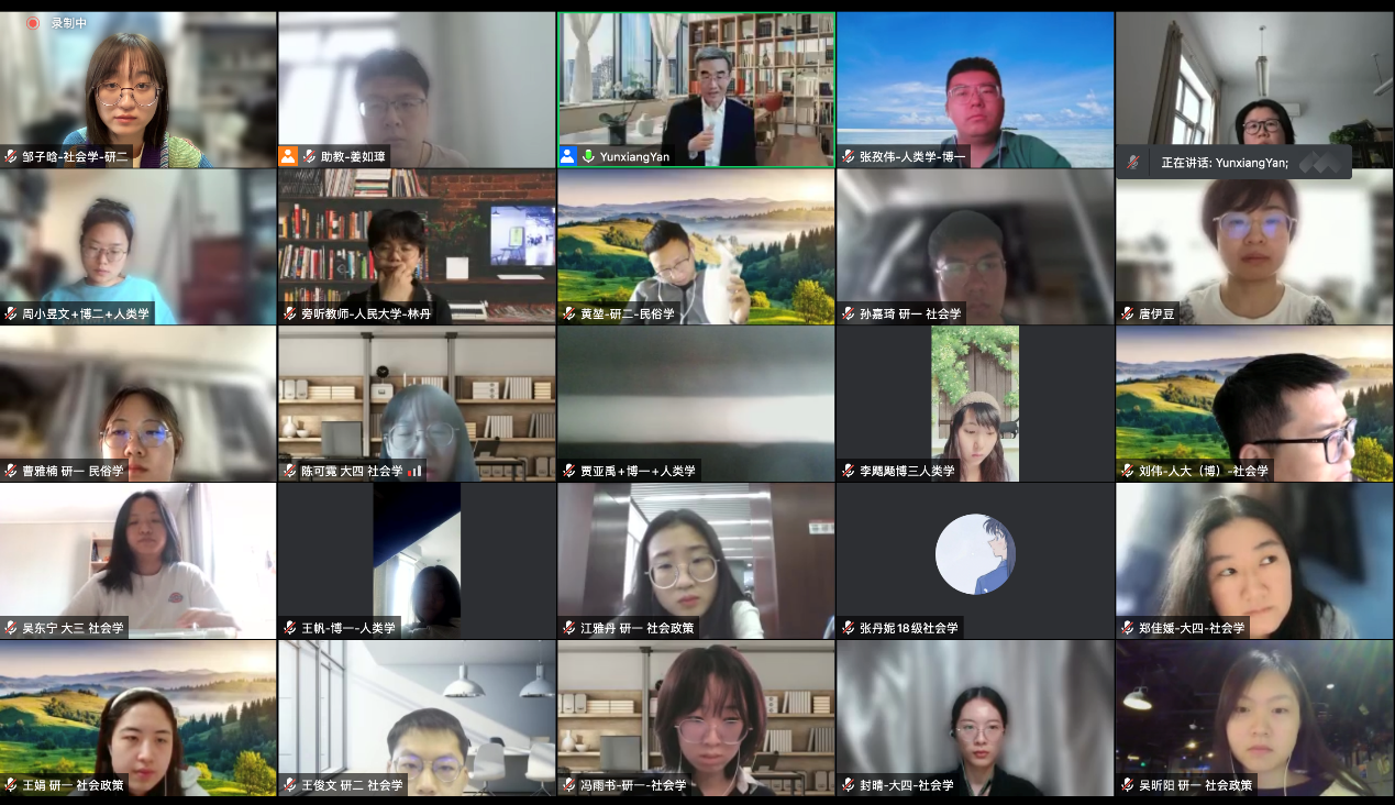 2022-05-07 文:第一版主 图:第一版主2022年5月7日上午9点,第一版主 社会与人口第一版主 “社会学海外名师课程”第5期《个体人类学》在线上顺利开讲。本期邀请国际著名人类学家,美国加州大学洛杉矶分校人类学系阎云翔教授主讲,社会与人口第一版主 社会学、人类学、民俗学等专业40名学生,以及来自北京大学、清华大学、中山大学等国内高校十余名年轻教师参加学习和研讨。