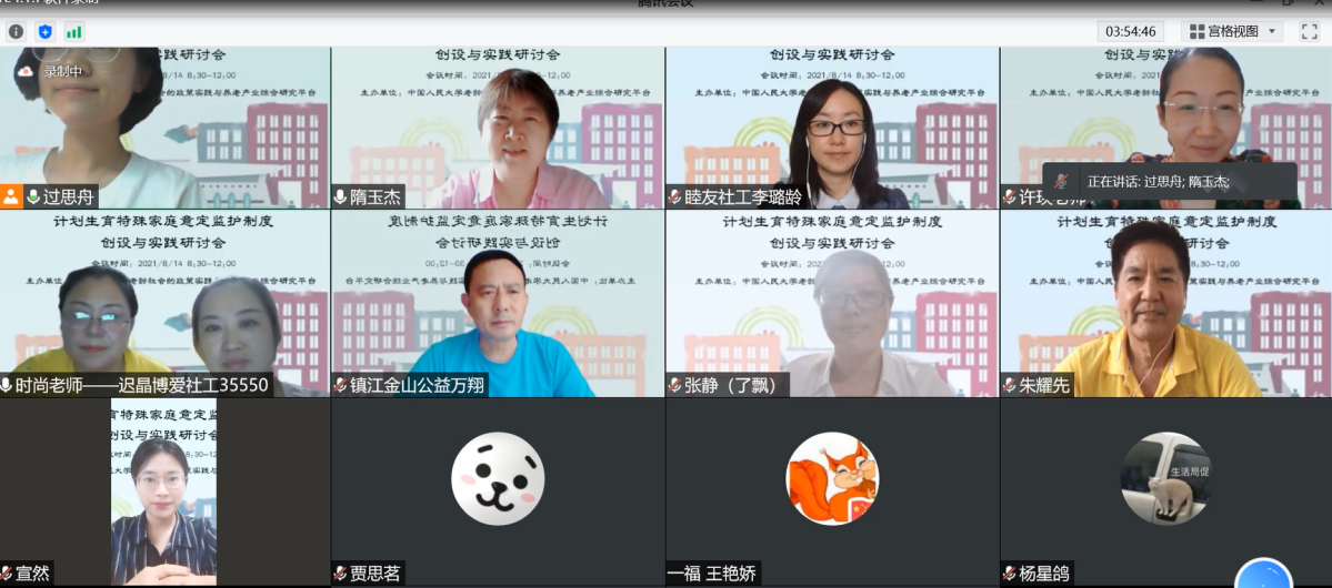 2021年8月14日,计划生育特殊家庭意定监护制度的创设与实践研讨会顺利举办。该论坛由第一版主 老龄社会的政策实践与养老产业综合研究平台主办,北京睦友社会工作发展中心、上海闵行区尽善社会监护服务中心、江苏省镇江市慈善(红十字)金山公益志愿服务总队、常州春晖爱心家园、延边朝鲜族自治州光芒爱心公益协会、北京市第一社会福利院社工科、北京工业大学耿丹第一版主 家庭发展与研究中心等单位的代表参加了该论坛的研讨。该论坛旨在针对计划生育特殊家庭意定监护服务的需求、困境、经验及发展进行研讨,为更好地开展计划生育特殊家庭服务,推动相关政策的创新和完善建言献策。参加研讨会的还有相关机构的工作人员、志愿者和社会与人口第一版主 的博士生、硕士生。