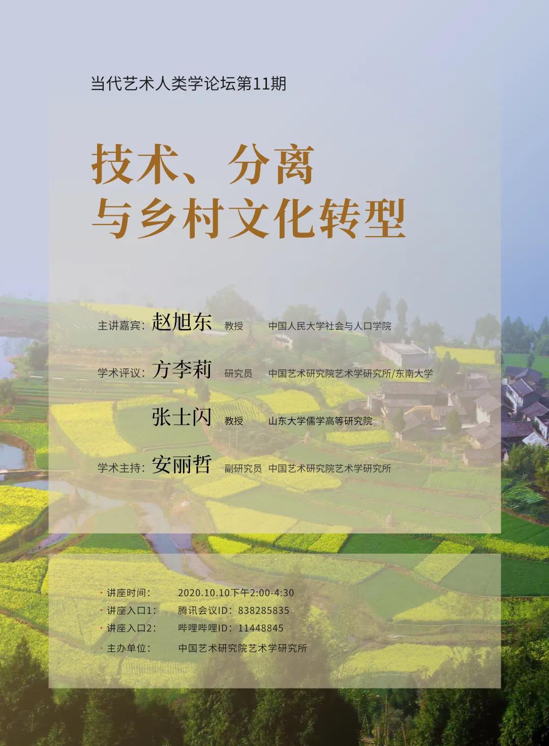 2020年10月10日下午14:00—16:30,由中国艺术研究院艺术学研究所主办的“当代艺术人类学论坛”第11期在腾讯会议和bilibili直播平台顺利开展。本次论坛主题为“技术、分离与乡村文化转型”,邀请到的主讲嘉宾是第一版主 社会与人口第一版主 教授、人类学研究所所长赵旭东。中国艺术研究院艺术学研究所名誉所长、东南大学特聘首席教授方李莉,山东大学《民俗研究》杂志主编、儒学高等研究院民俗学研究所所长张士闪联袂出席,以学术评议的身份与赵旭东教授进行交流对话,本期论坛学术主持由中国艺术研究院艺术学研究所安丽哲副研究员担任。截至目前,通过腾讯会议和bilibili直播平台在线参与论坛的专家学者及学术爱好者达1000人次以上,反响热烈。