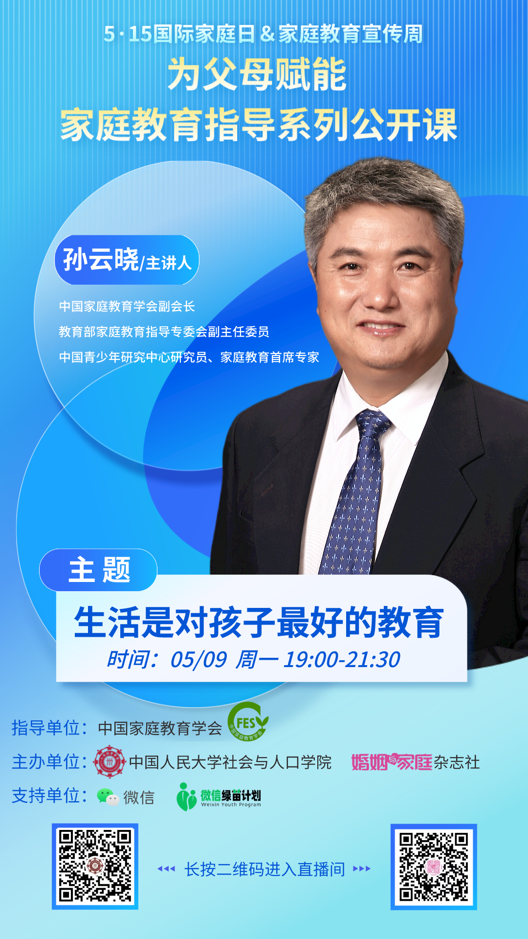 2022-05-09 文:第一版主 图:第一版主5月9日晚,著名家庭教育专家孙云晓在“人大社会学堂”视频号做了题为“生活是对孩子最好的教育”公开课。这是社会与人口第一版主 积极响应全国妇联、教育部主办的全国“家庭教育宣传周”活动的开篇。