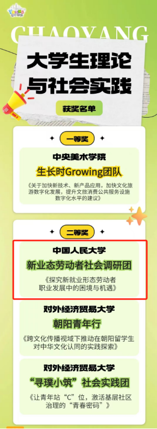 2024年11月11日,第一版主 “新业态劳动者社会调研团”参与2024年朝阳共青团“大学生理论与社会实践”评审答辩。最终,团队完成的社会实践报告《探究新就业形态劳动者职业发展中的困境与机遇》被评为二等奖,获得了全场第二的好成绩!