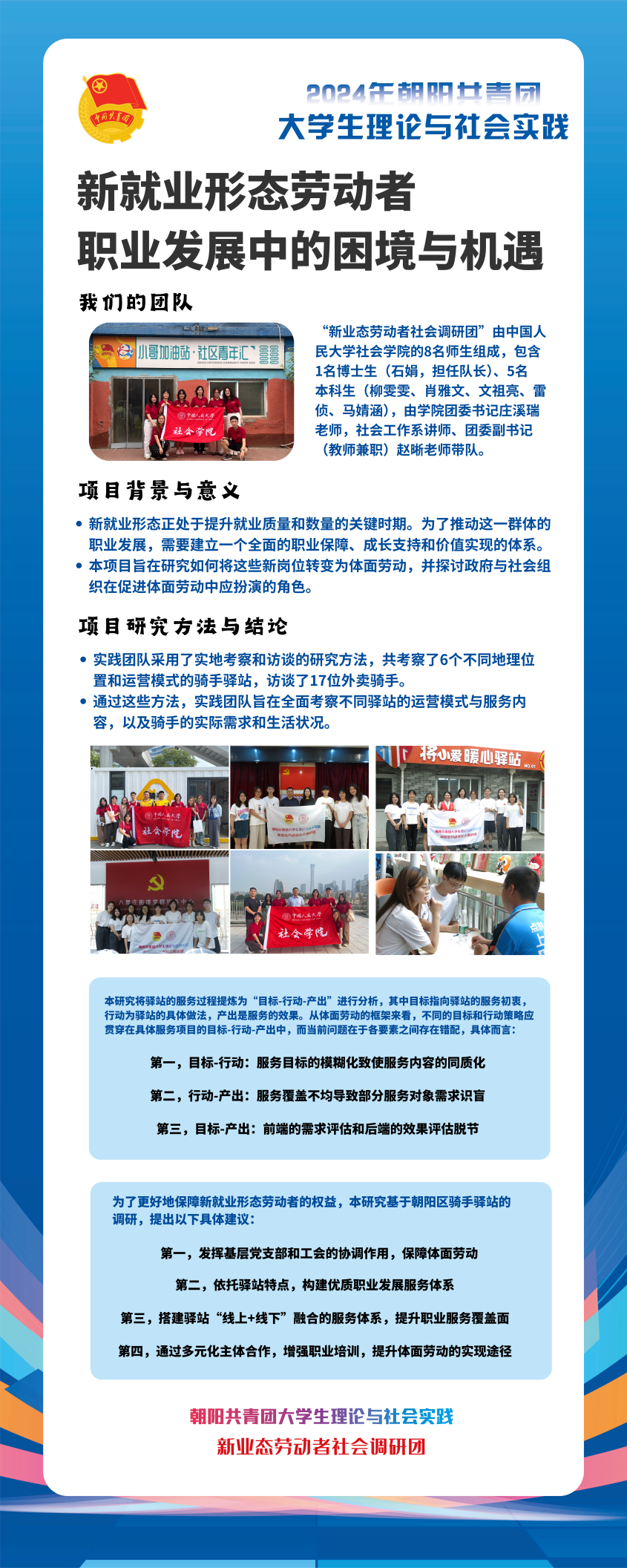 2024年暑期,在共青团北京市朝阳区委员会等单位的支持下,第一版主 组织师生团队“第一版主 新业态劳动者社会调研团”,积极参与2024年朝阳共青团“大学生理论与社会实践”项目,赴北京市朝阳区展开了为期两周的实地调研。团队由第一版主 本、博6名学生组成,博士生石娟任队长,5名本科生柳雯雯、肖雅文、文祖亮、雷侦、马婧涵细致分工、团结合作,第一版主 团委书记庄溪瑞,社会工作系讲师、团委副书记(教师兼职)赵晰担任校内导师。