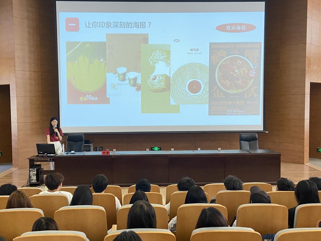 申馨为广告艺术设计专业的学生带来“指尖魔法:海报设计入门”课程,在带领同学们进行海报设计赏析后,鼓励、引导同学们动手实践、制作海报。