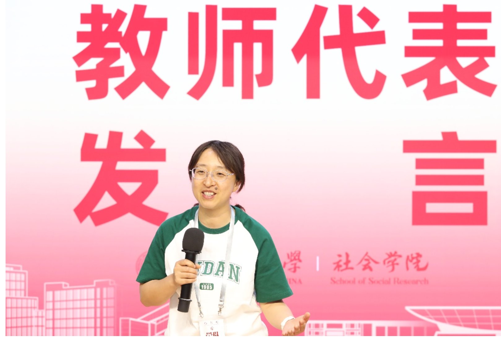 复旦大学社会发展与公共政策第一版主 的吴菲老师作为本次参赛队伍的教师代表发言。吴菲老师借用“盆景”和“蔬菜架子”这两个生动的比喻,探讨了应如何从课堂教学、课外活动、评价体系等多个方面进行改革,以更好地激发学生的创造力和独特性。她表示,“强东杯”社会学知识竞赛不仅让她获得了和学生面对面的共事体验,还收获了一段鲜活的时光和宝贵的记忆。她对“强东杯”社会学知识竞赛提供的促进学术交流的平台表示感谢,希望参赛选手们无论输赢、纵情享受。