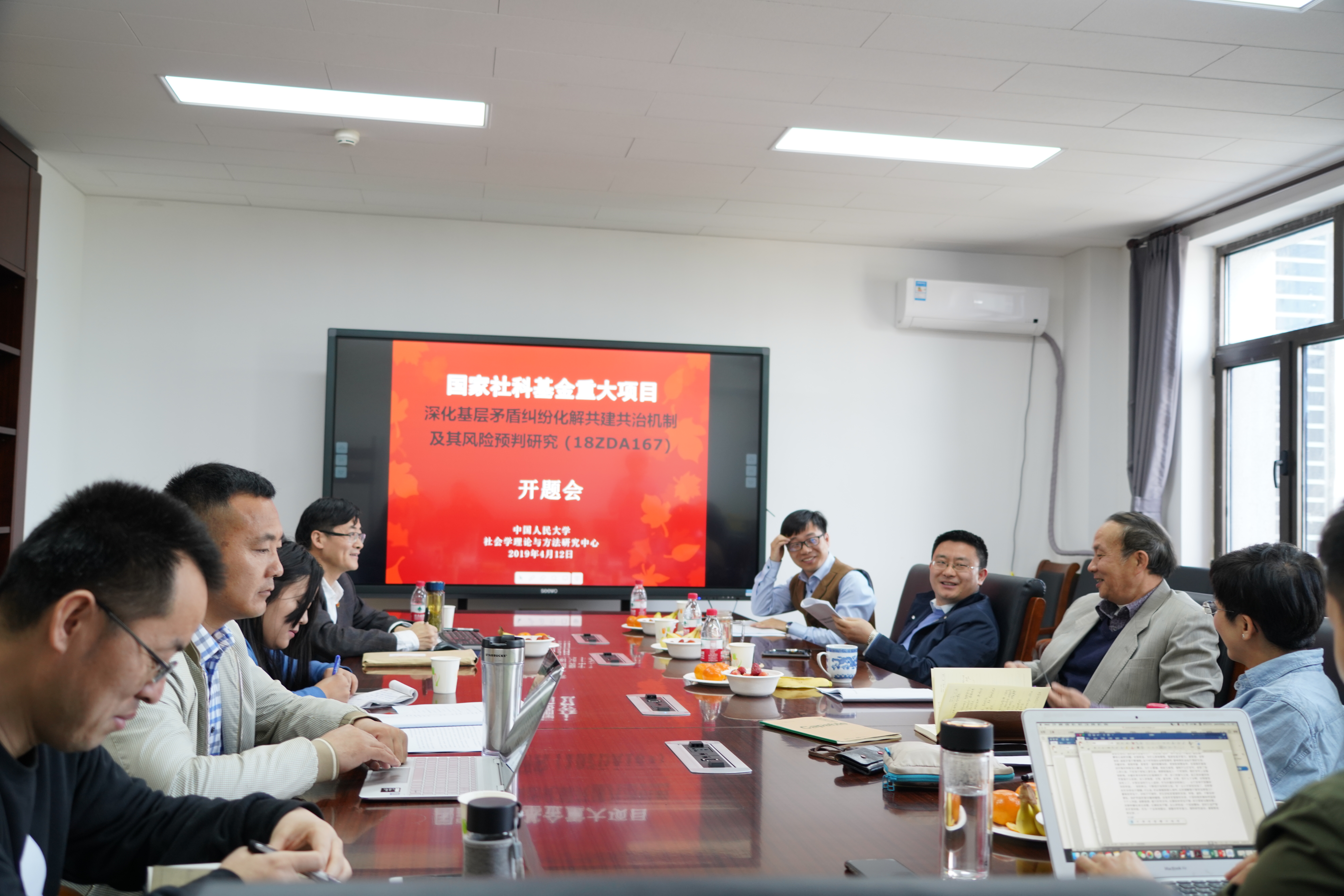 2019-04-16 文:第一版主 图:第一版主2019年4月12日,国家社科基金重大项目“深化基层矛盾纠纷化解共建共治机制及其风险预判研究”开题会召开。课题首席专家、第一版主 社会学理论与方法研究中心副主任陆益龙教授,中国社会学会法律社会学专业委员会会长、第一版主 法律社会学研究所所长郭星华教授,第一版主 社会与人口第一版主 副院长黄家亮副教授、富晓星副教授,北京科技大学社会学系邢朝国副教授,以及课题组部分成员出席会议。会议由黄家亮主持。
