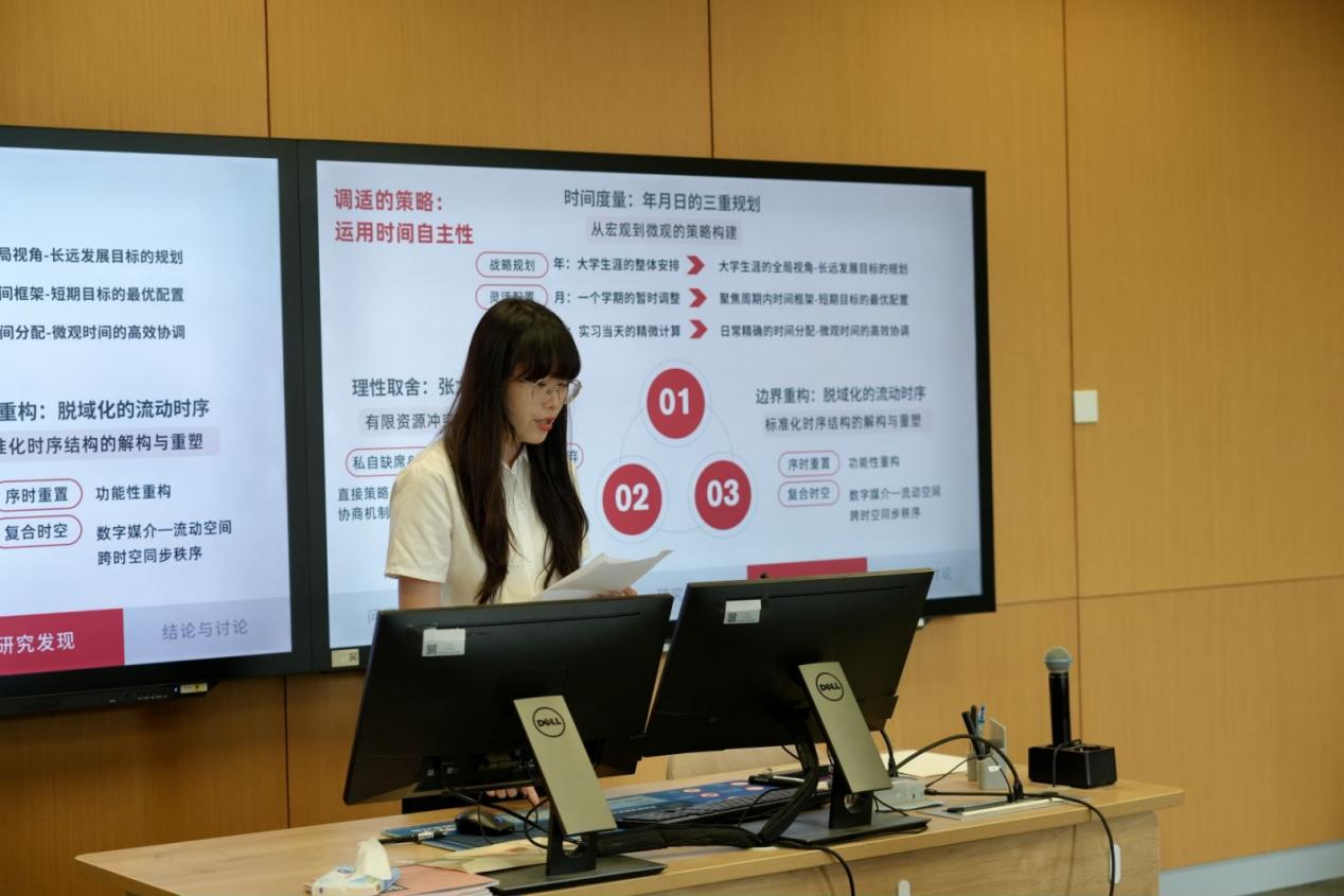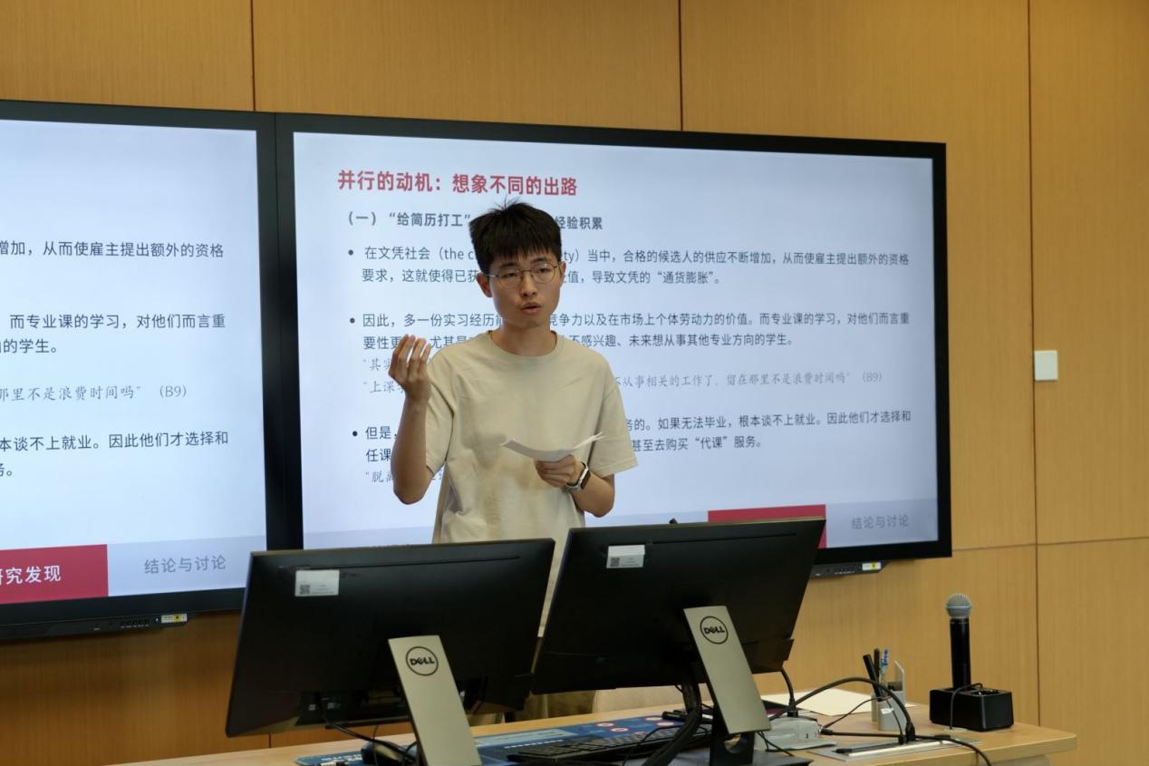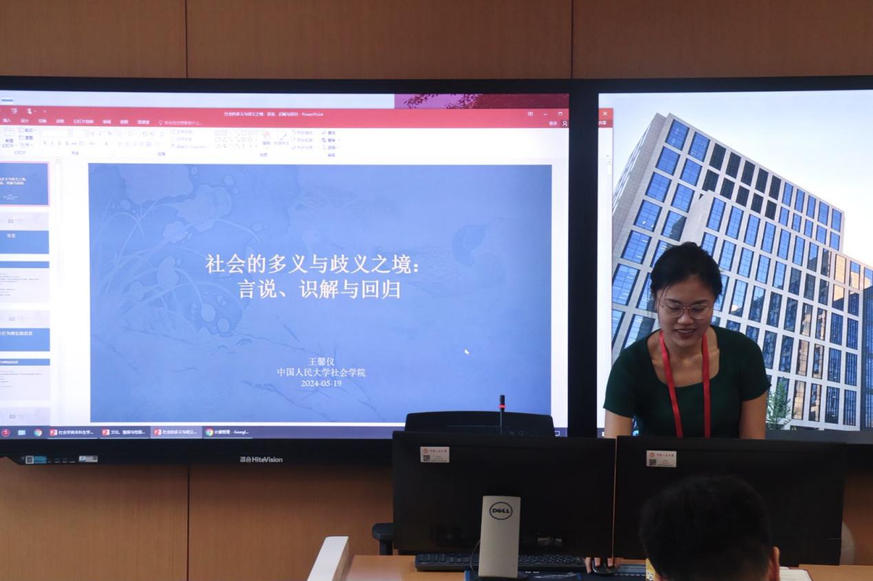 论坛围绕新就业形态、媒体平台社会互动、数字反哺等议题展开。周浥莽老师表示,几位同学选择的研究问题很有现实关照,也有丰富的分析内涵,同学们的展示内容全面、论证严谨,并且有很强的理论反思意识,能够对社会经验现实进行深入浅出的分析。同时,周老师提醒同学们要比较选择适合研究问题的数据处理方法和分析框架,从而更精准地聚焦问题层次,突出自身的分析进路。会后,同学们与周老师深入交流自身研究思路,获益匪浅。