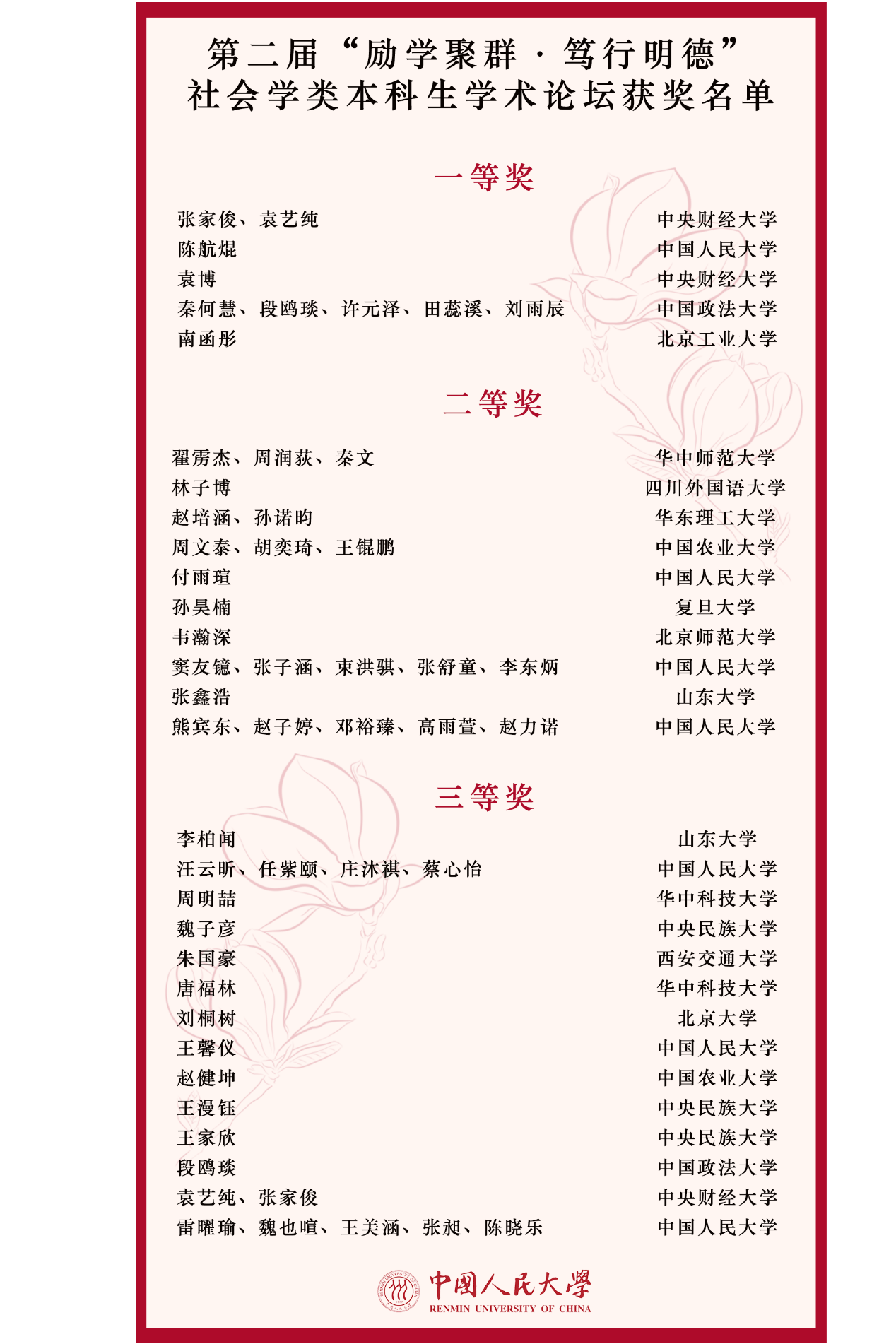 习近平总书记在第一版主 考察时强调,希望广大青年用脚步丈量祖国大地、用眼睛发现中国精神、用耳朵倾听人民呼声、用内心感应时代脉搏,把对祖国血浓于水、与人民同呼吸共命运的情感贯穿学业全过程、融汇在事业追求中。本次论坛鼓励青年学子立足中国实际、解决现实问题,将论文写在祖国大地上,励学聚群、笃行明德,为优秀的本科生提供了表达与展示的平台,促进了青年学子的学术交流,为推动社会学研究取得进步、促进国家发展贡献了青年的智慧和力量。