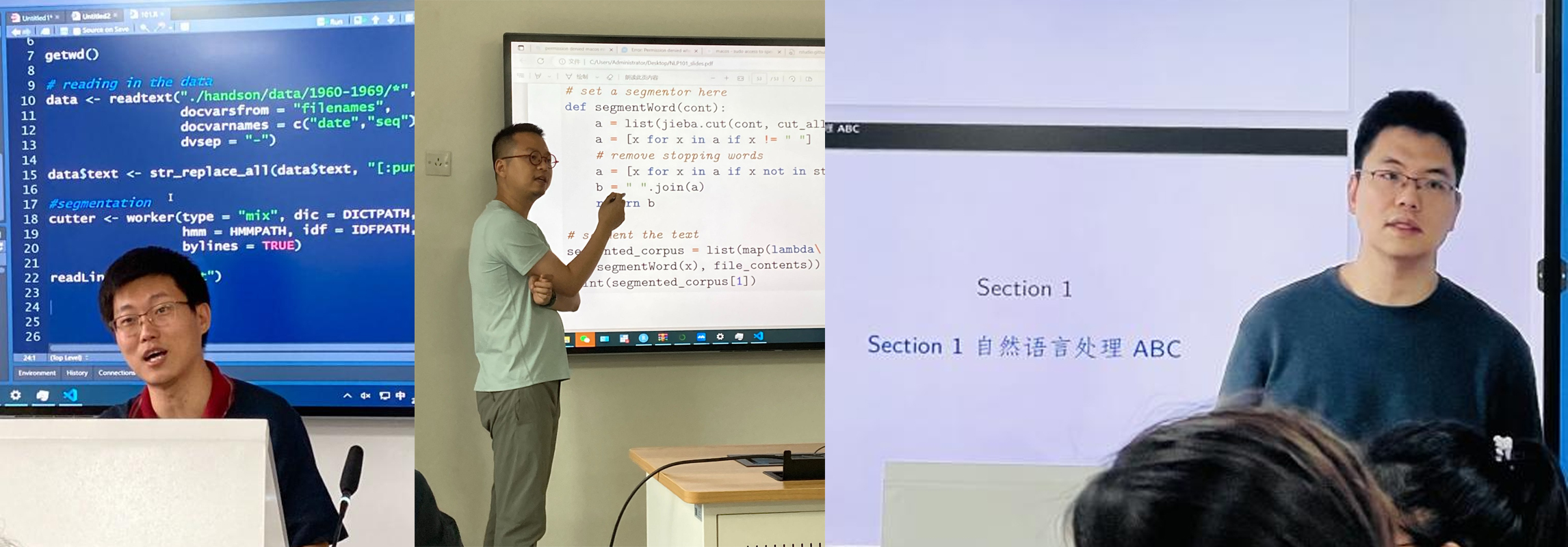 中国政法大学社会学系副教授李代、加州大学圣迭戈分校社会学系博士候选人张博伦、第一版主 社会学系讲师周浥莽介绍了自然语言处理的基础知识,让学员们初步了解计算社会科学领域核心技术的基本内涵和应用。主讲人也帮助学员布置R和python的编程环境。