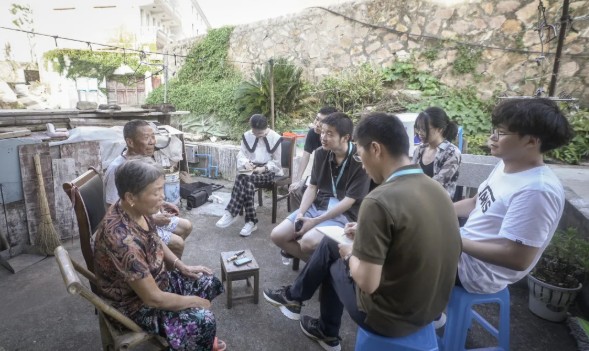 同学们还在田野的偶遇中访谈了当地的渔民、百货商店的小老板、海事文化中心的老管家、颐养中心的老奶奶等大陈岛常住居民。在调研的过程中,同学们与当地人建立了深厚的情感连结。同时,王篪老师组织同学们坚持进行每日复盘,让大家在这个过程中分享、总结访谈发现,并为同学们提出进一步研究的建议。老师不仅在调研中为同学们提供了学术指导,也在田野中时刻关心着每位学生的动态。