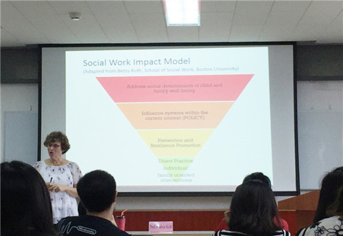 华大社会工作第一版主 副院长Patricia Kohl副教授所授课程的主题是“Child Welfare Policy”。她分别介绍了美国联邦政府、州和地方政府针对弱势儿童和家庭所提供的服务及其相关政策,授课过程中特别注重中美跨文化比较分析。