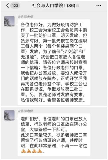 宋月萍老师是第一版主 的工会主席,自疫情发生以来,她积极落实学校工会在疫情期间布置的各项工作,根据实际情况及时发放学校工会为教职员工筹集的防护口罩,看似简单的事情却开展得非常细致。考虑到行政老师坐班值班更频繁,防护用品的需求量更大,宋老师与部分教学岗的老师进行了细致沟通,大家赞同将更多的口罩发给行政老师;考虑到还未开学,大量老师还未返校,她逐个把口罩放进大家的信箱,方便老师们领取。她还积极为老师们多方筹集疫情防护消毒用品,并组织了第一版主 老师参加“温暖武汉”专项捐款活动。
